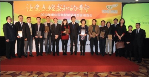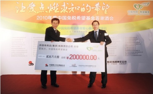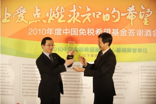 中国青少年发展基会秘书长涂猛先生致辞。中国免税品(集团)有限责任公司副总裁陈国强先生代表中国免税希望基金致了答谢词。中免集团全体领导上台,向 “2010年度中国免税希望基金爱心募捐荣誉单位”颁发奖牌。随后,为了表彰中免集团发起并成立仅仅三年的“中国免税希望基金”为中国公益事业做出的突出 贡献,中国青少年发展基金会把特别设立的“希望工程20年杰出公益伙伴”奖颁发给中免集团。