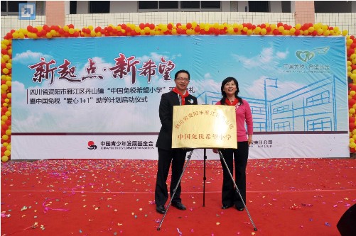 2010年10月11日上午,位于四川省资阳市雁江区丹山镇牌坊村的中国免税希望小学里喜气洋洋、热闹非凡。特意从北京赶来的中国青少年发展基金会的汪 敏副秘书长、冯敏慧部长,中免集团卢路总裁和四川省市两地的领导与全校近两百名师生一起为新落成的“资阳市雁江区丹山镇中国免税希望小学”举行了隆重的落 成典礼。