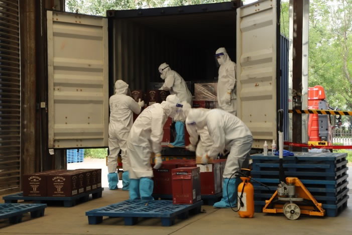 近日,又一批海运集装箱抵达物流基地。首都机场联合党支部成立的党员先锋队配合执行消杀卸货工作。大家先对集装箱进行彻底无死角的全面消杀,随后将货物分批搬运、拆箱,对货物单个最小包装物进行逐一消杀,最后再统一装箱。历时5个小时,将全部货物消杀完毕,为后续工作建立了第一道安全保障。