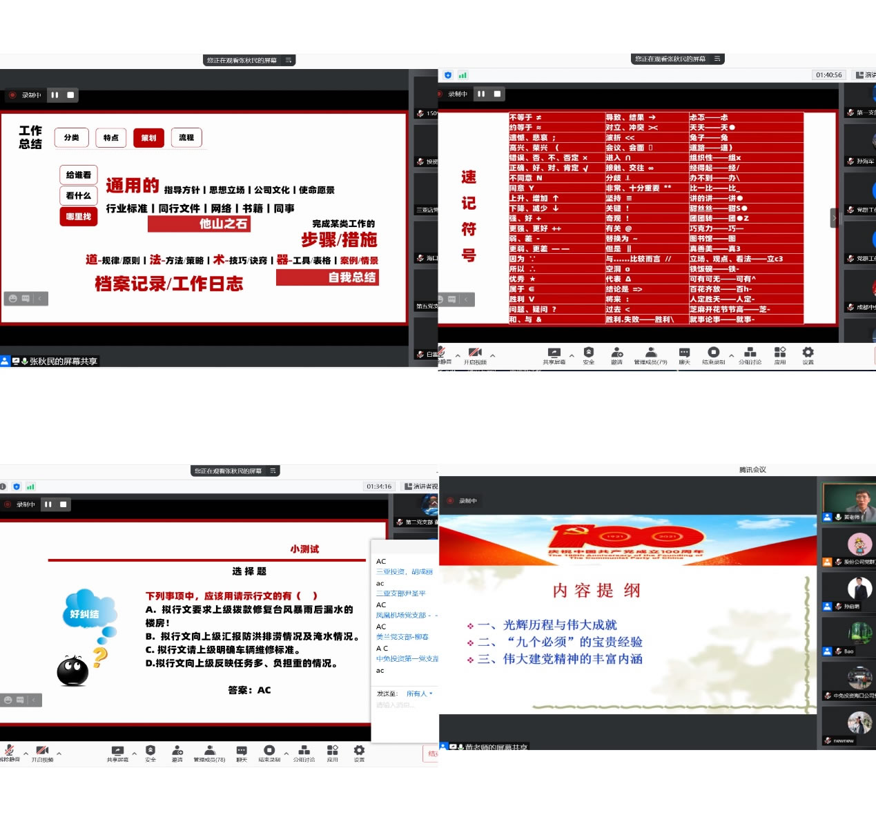 公司党群工作部就本次培训的课程安排进行了认真研究。在课程设置上,注重理论武装与党务实操有机结合。在师资配备上,邀请中央党校教授、中国纪检监察学院教授和公司内外部优秀党务工作者,围绕习近平总书记“七一”重要讲话精神、全国国有企业党的建设工作会议和中央企业党的建设工作座谈会精神、党章党规党纪等方面进行解读;围绕党建工作与生产经营深度融合、国有企业优秀党支部经验进行分享;围绕党务公文写作的方法和技巧等实务内容进行授课。在培训形式上,做到了既有理论学习、实务培训,还有课堂讲授、交流互动,参训学员纷纷表示“干货满满,接地气,有价值、很受益。”