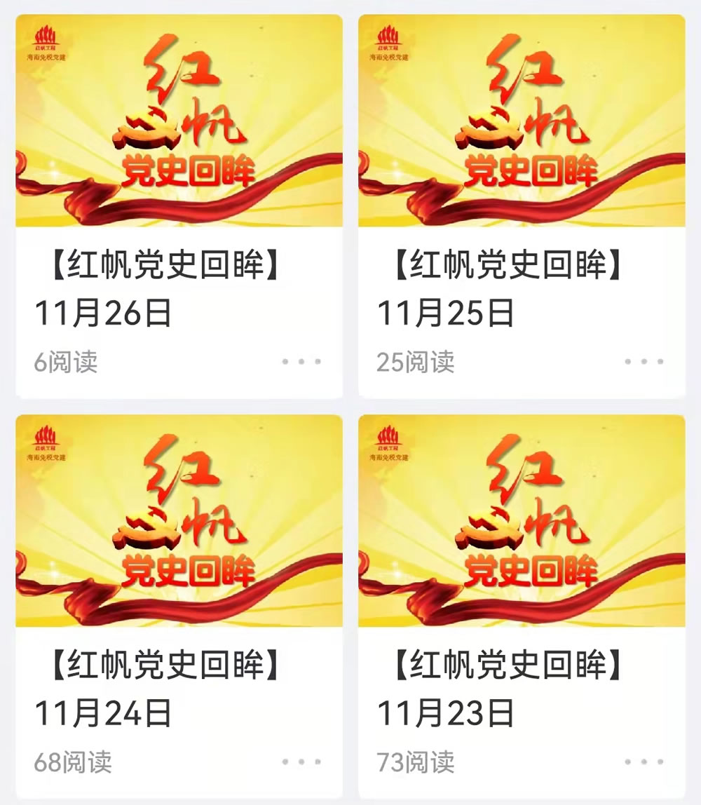 “红帆工程”创建以来,始终发挥思想政治引领作用。在公司党建微信公众号先后开辟了“红帆学习”“红帆课堂”“红帆讲习堂”栏目,适时推送习近平新时代中国特色社会主义思想学习内容、习近平总书记的重要讲话、重要指示批示精神以及集团公司、股份公司最新指示精神,共发送各类推文100余篇。2021年党史学习教育期间,为进一步引导公司员工学党史、知党情、跟党走,在公司OA办公系统、美篇上设置“红帆党史回眸”专栏,每日通过系统和微信群向党员推送“党史回眸”学习资料220篇。相应栏目的开办,进一步强化了思想政治引领作用,激发了员工爱党爱国的巨大热情,凝聚了员工士气,提升了党建工作实效。