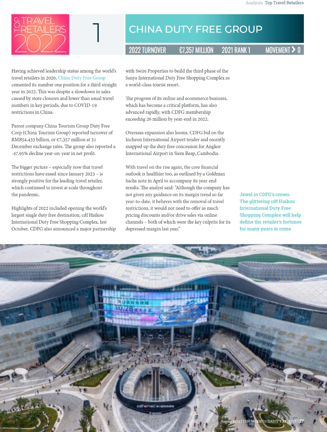 2023年8月28日,全球旅游零售行业权威媒体《穆迪达维特免税报告》(The Moodie Davitt Report)发布《全球领先旅游零售商报告》,对过去一年来全球前20名旅游零售商展开了跟踪评估。报告显示,根据2022年营业额统计,中免集团连续第三年在全球顶级旅游零售商中保持领先地位,成为2022年全球最大旅游零售商。