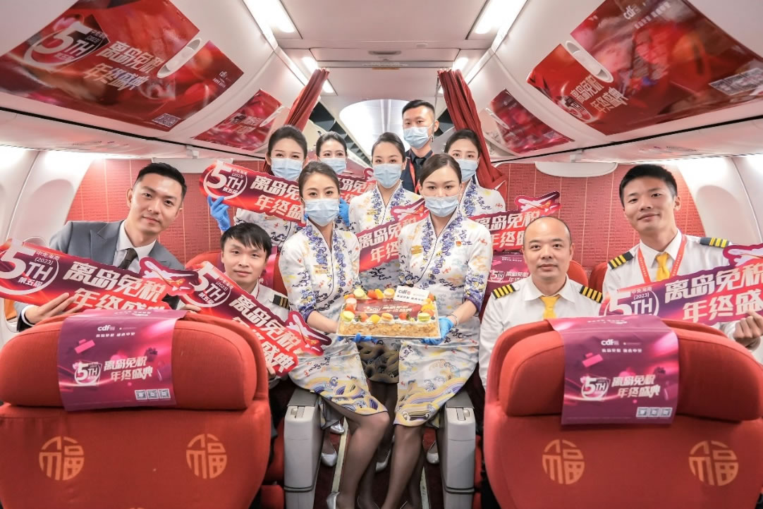 中免集团联动航空资源推出主题航班活动,带来了沉浸式的新鲜有趣互动体验。11月15日,cdf海口国际免税城联合cdf海口日月广场免税店、cdf海口美兰机场免税店,联动海南航空,于HU7782北京-海口航班上开展主题航班活动,通过营造节庆氛围,开展互动问答等趣味活动,与机上旅客积极互动,并予以乘坐该航班旅客相应购物权益。cdf三亚国际免税城也在HO1747南京—三亚的吉祥航空主题航班上为乘客精心准备了主题蛋糕及消费权益,在丰富乘机体验的同时,更增强旅客对于免税及活动的了解。