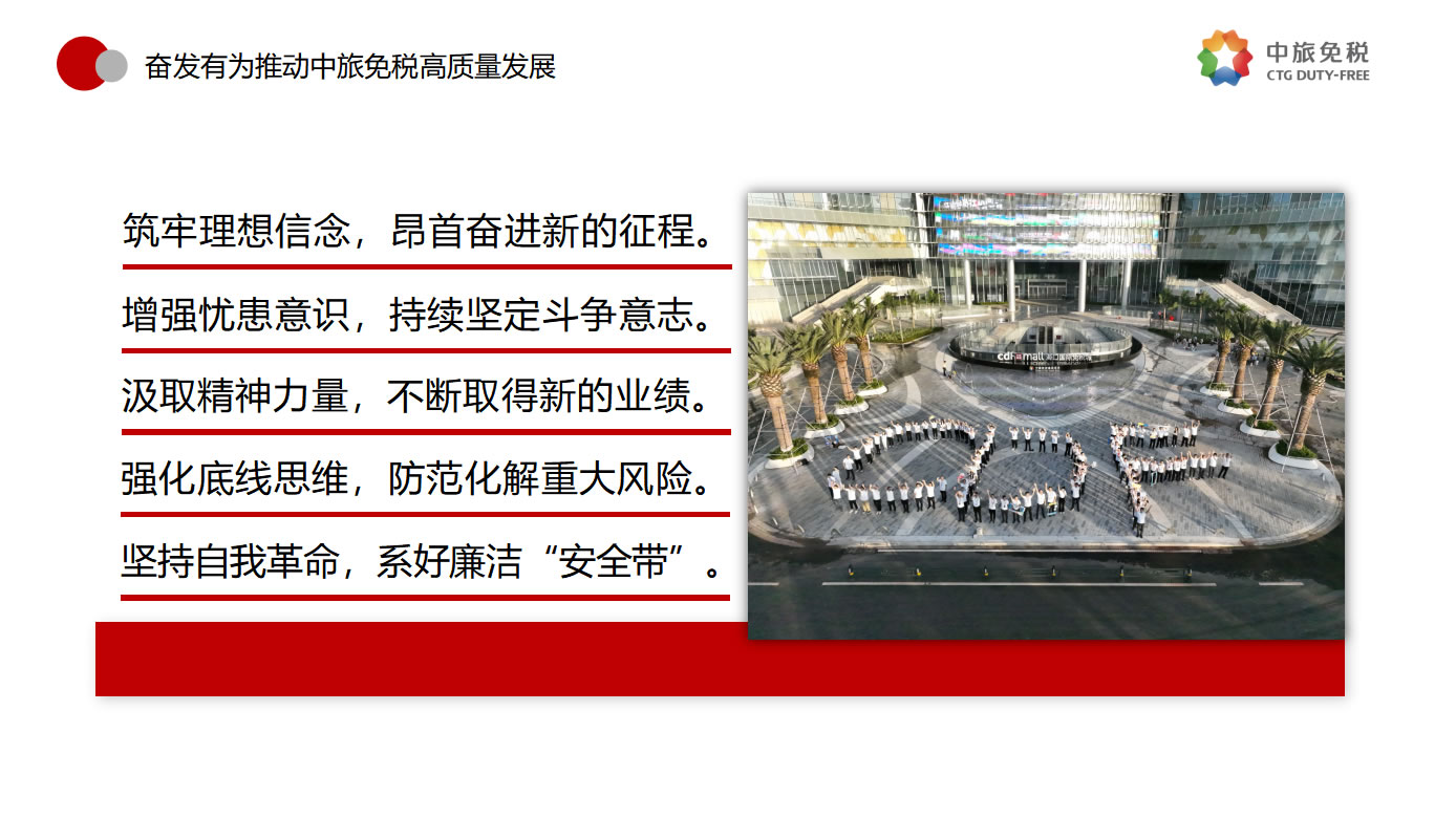 一是筑牢理想信念,昂首奋进新的征程。要坚决贯彻落实总书记指示,优化发展方式,注重发展品质,追求质量更优、效益更好、效率更高的可持续增长,做强做优公司核心竞争优势,全面提升公司经营发展的系统能力。二是增强忧患意识,持续坚定斗争意志。要进一步强化危机意识、忧患意识,主动担责、主动担难、主动担险,以强烈的使命感和责任感,统一思想、统一意志、统一行动。三是汲取精神力量,不断取得新的业绩。要以“红色引擎 免税先锋”“海棠精神”“红帆工程”等党建品牌活动为切入点,进一步提升基层党组织的组织力,通过共建活动平台、分享工作资源、交流工作经验、解决实际问题等途径,实现党的建设与业务发展建设良性互动,以深入推进全面从严治党引领保障高质量发展。四是强化底线思维,防范化解重大风险。要深刻领会习近平总书记关于强化底线思维,防范化解重大风险的重要论述,充分认清当前面临的形势任务,系统梳理查找存在的突出风险问题,自觉从习近平新时代中国特色社会主义思想中找到破解矛盾问题的钥匙,努力在新思想指引下探索推动高质量发展的路径。五是坚持自我革命,系好廉洁的“安全带”。要继续发扬自我革命精神,纵深推进党风廉政建设和反腐败斗争,一体推进“不敢腐、不能腐、不想腐”,围绕财经领域专项整治等重点问题、紧盯海南地区所属的重点企业和重点项目,以及防范离岛免税“套代购”、传统渠道免税店经营风险等重点领域和巡视整改等重点工作,深化标本兼治、系统治理,以新时代廉洁文化建设,涵养求真务实、团结奋斗的中免风貌。
